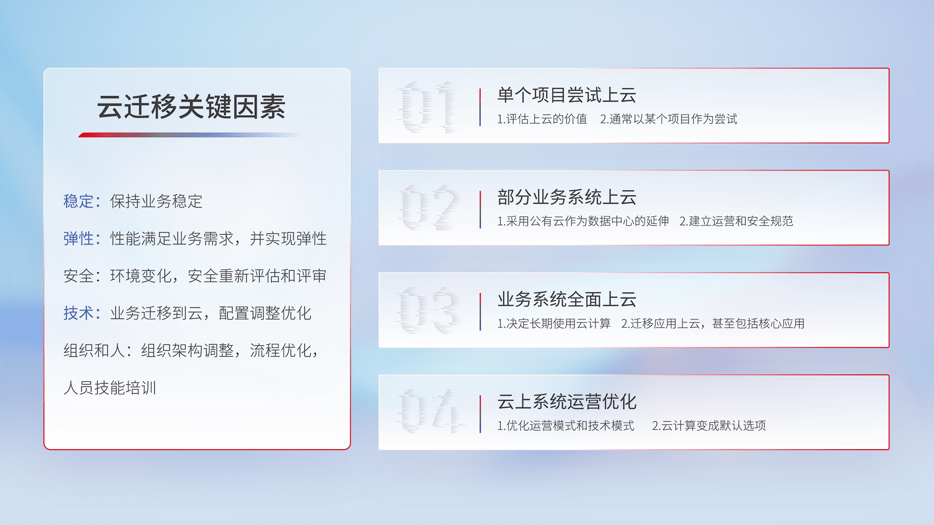 结合实际业务,,从规划设计、、云平台选型、、、云原生改造、、数据迁移、、、集成交付,,,迁移全过程为客户识别最佳上云路径,,,,做好风险识别管理,,,,设计网络架构、、、身份权限、、、、安全审计合规、、、、操作审计、、日志审计、、监控告警策略、、、多站点容灾设计等,,,对云上基础设施进行整体规划,,,,提升IT治理水平,,,,以满足弹性、、、高可用、、高性能的需求。。。。